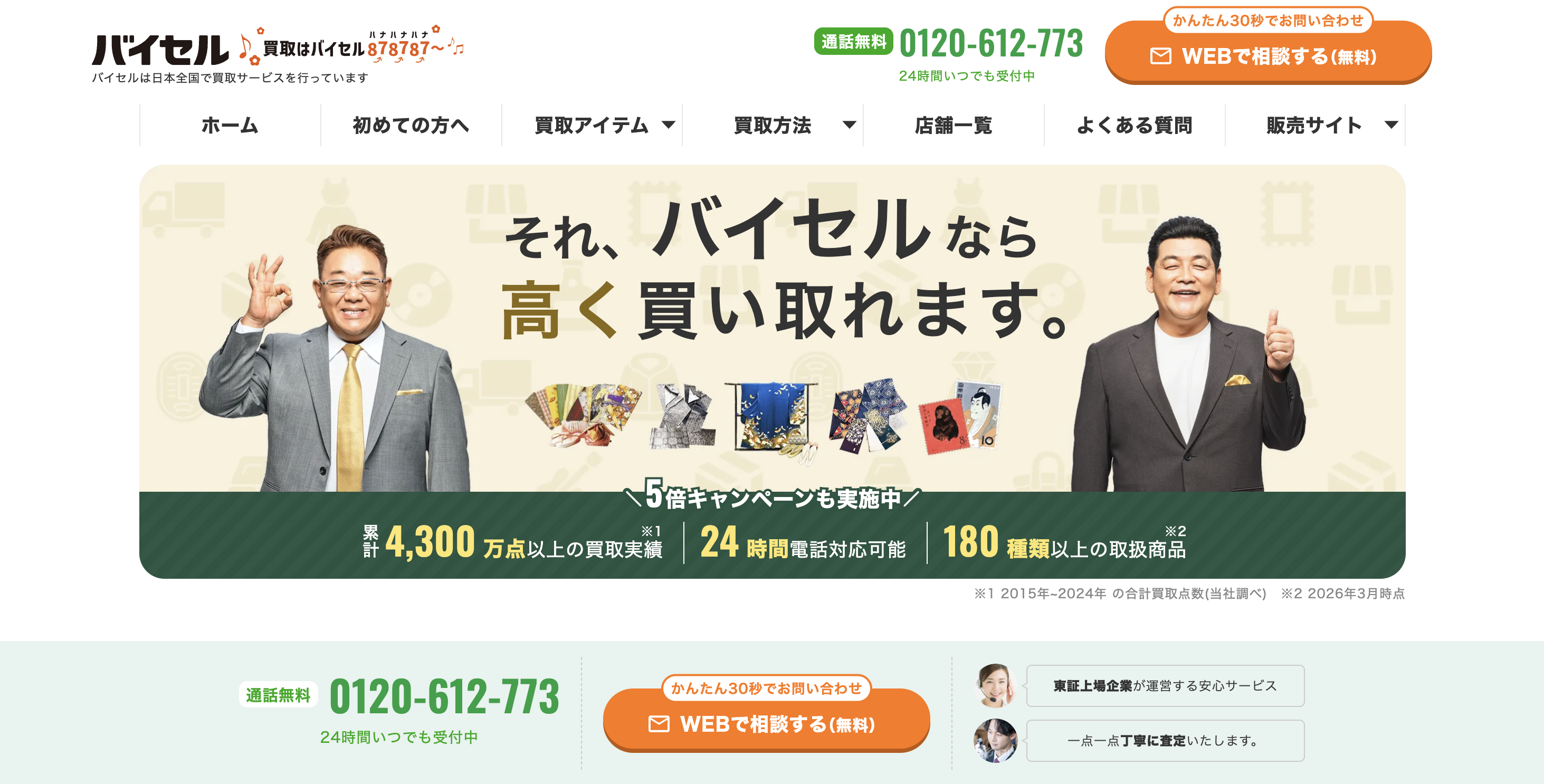 バイセルは、累計3,700万点以上という圧倒的な買取実績を誇る大手買取サービスです。東証グロース市場に上場している企業が運営しており、企業としての信頼性は抜群となっています。特筆すべきは、24時間365日いつでも受付している点と、予約状況によっては最短即日で自宅訪問が可能な点です。「今すぐ売りたい」「仕事が忙しくて日中は電話できない」という方でも、自分のタイミングで相談できます。