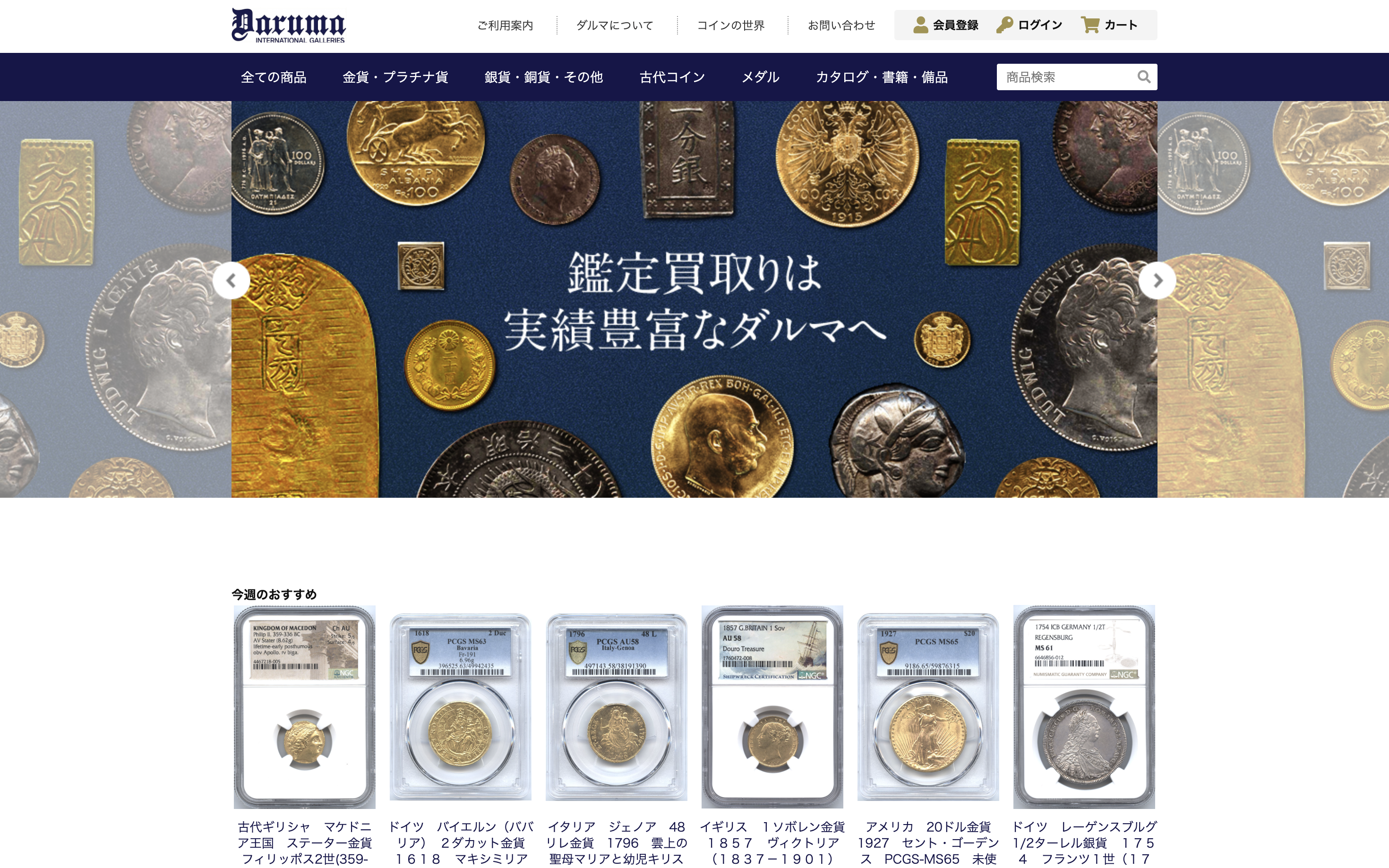 ダルマコインショップは、外国コインに特化した専門店です。日本貨幣商協同組合に加え、I.A.P.N.(国際コインディーラー協会)、スイス貨幣商協会、英国貨幣協会という4つの業界団体に加盟しており、国際的なネットワークを持っています。海外で購入したコインや、古代ギリシャ・ローマ時代のアンティークコインなど、国内では評価が難しい品物でも、国際的な相場を踏まえた適正価格で査定してもらえる可能性があります。外国コインの売却を考えているなら、まず相談すべき専門店です。