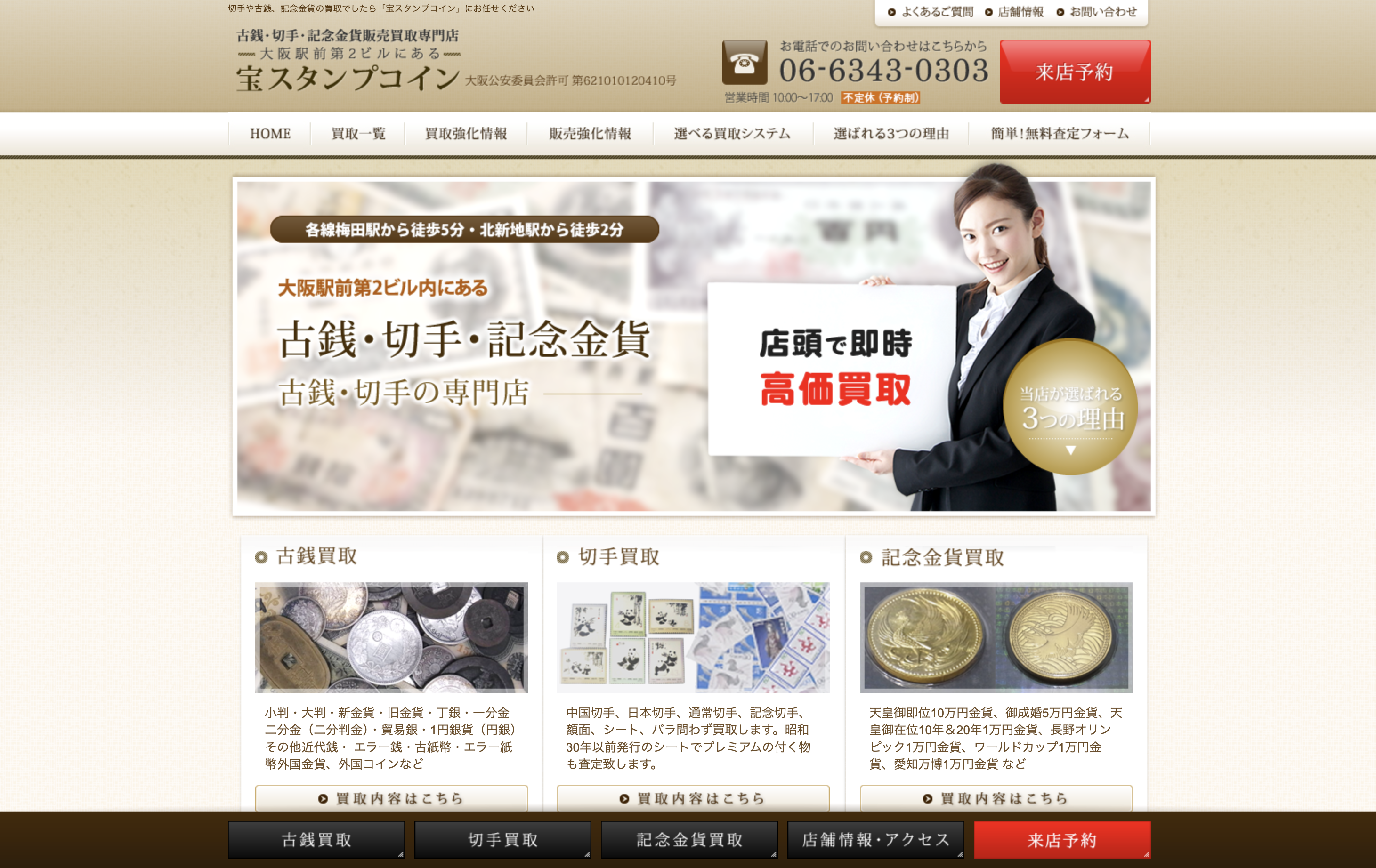公式サイトでは買取件数11万件以上の実績が紹介されており、長年にわたって多くの古銭を取り扱ってきた経験があります。各線梅田駅から徒歩5分、大阪駅から徒歩7分という好立地も大きな魅力です。「今日中に売りたい」という方には、店頭持ち込みでその場査定・即日現金化に対応しているのもポイントです。