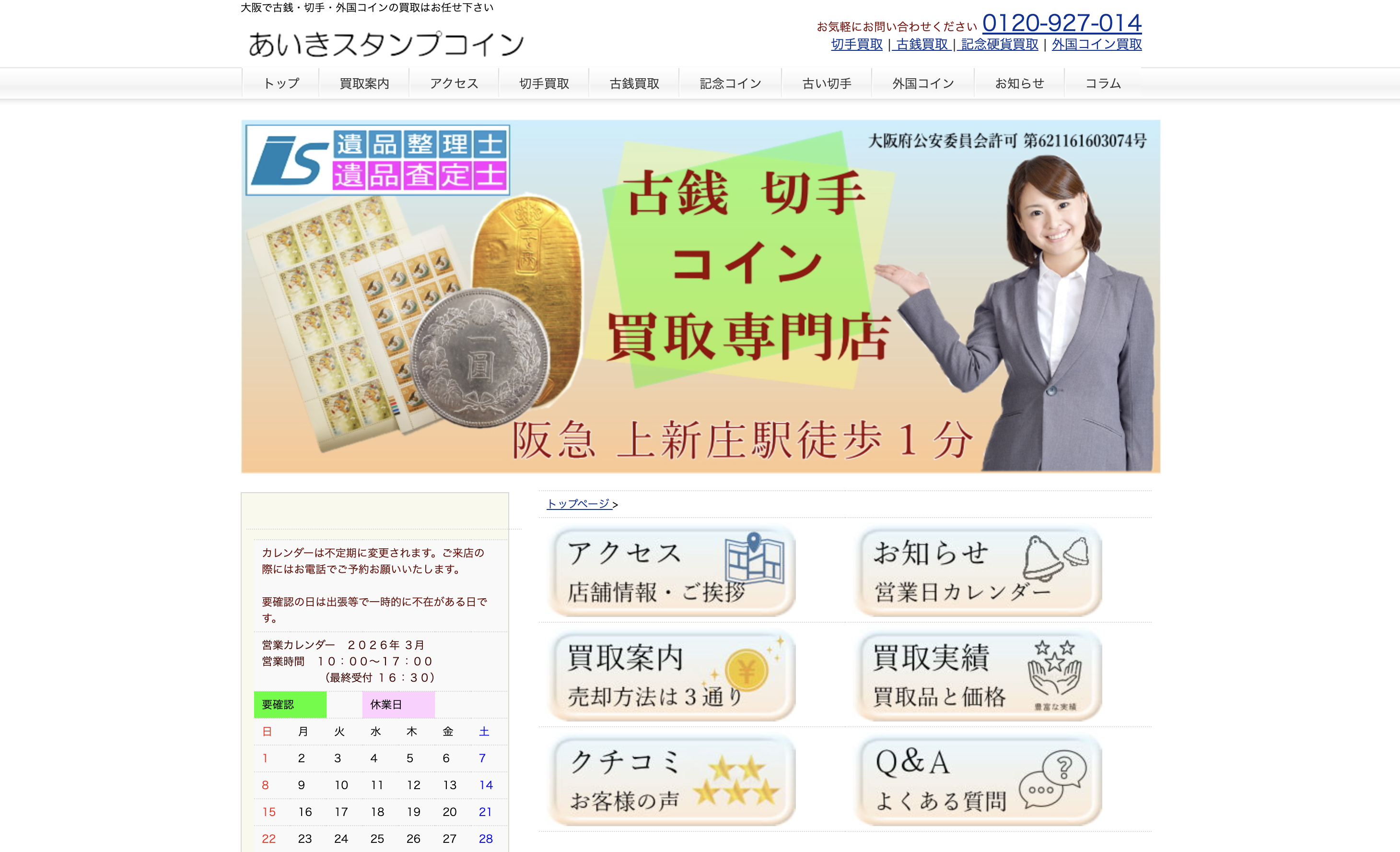 大阪駅前第2ビル2階という分かりやすい立地にあり、仕事帰りや買い物のついでに立ち寄りやすい環境です。店頭買取は予約不要なので、「まずは見てもらいたい」という方も気軽に足を運べます。公式サイトでは古銭に関するコラムも多数公開されており、売却前に相場感を確認したい方にも参考になります。専門店ならではの知識で、一般的なリサイクルショップでは見落とされがちな価値も適切に評価してもらえるでしょう。郵送・出張買取にも対応しているため、店頭に行けない場合でも利用可能です。