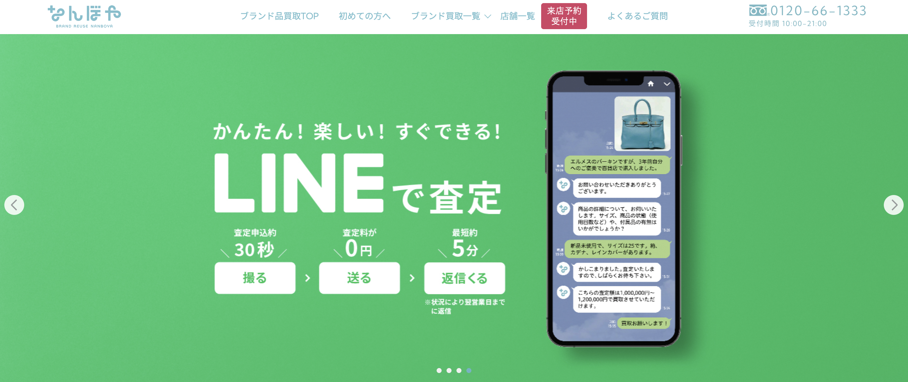 なんぼやは、東証グロース上場グループが運営する全国100店舗以上を展開する総合買取ブランドです。難波本店は11:00〜21:00まで営業しており、平日の仕事帰りでもゆっくり相談できるのが大きな強みです。来店時のサービスも充実しており、完全個室での査定対応のほか、待合室、ドリンクサービス、重い荷物用の台車サービス、駐車場代サポートまで用意されています。