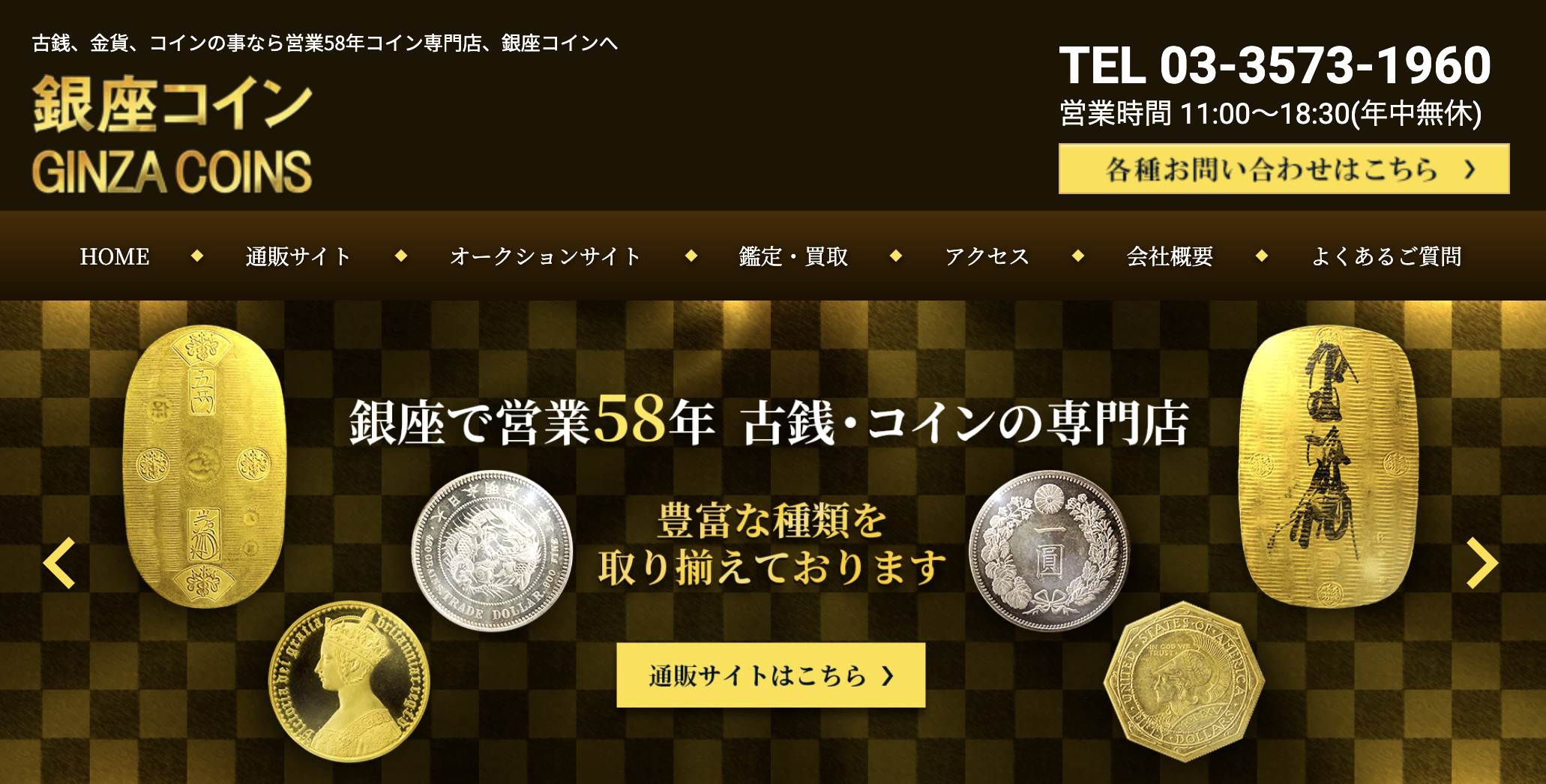 銀座コインは、買取だけでなく販売・オークションまで一貫して手がけるコイン専門店です。自社で「銀座コインオークション」を運営し、入札誌「銀座」を年5回発行するなど、コイン業界での存在感は大きく、オークションでの販売ルートを持っているため、希少コインの買取にも強みがあります。また、古銭・金貨・コインの鑑定・買取・販売に加え、相続相談にも対応しています。「親から受け継いだコインの価値を知りたい」「相続財産としてどう扱えばいいかわからない」といった相談も可能です。店舗は銀座ファイブ1階にあり、年中無休で営業しているため、観光や買い物のついでに立ち寄りやすいのもポイントです。