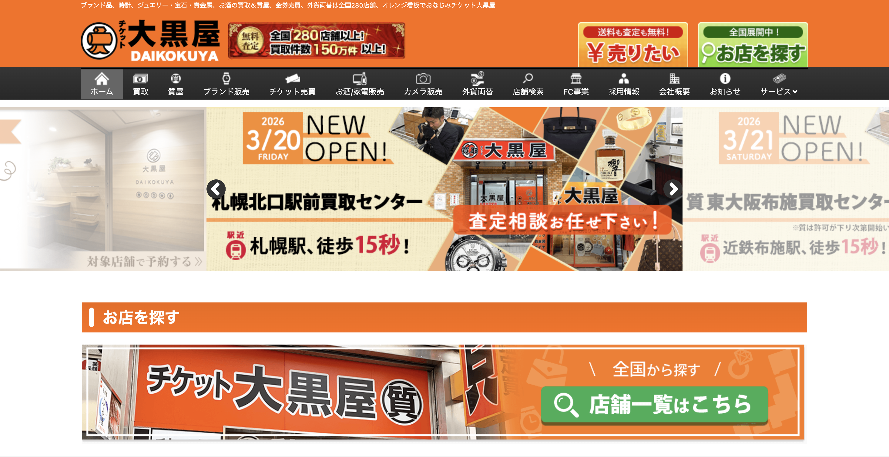 大黒屋は、全国280店舗以上を展開し、年間150万件を超える買取実績を誇る大手チェーンです。東京都内でも新宿・池袋・銀座・渋谷・上野など主要駅の近くに店舗があり、「買い物ついで」「仕事帰り」にサクッと立ち寄れるのが最大の強みです。出張対応ではなく店頭での持ち込み派にとっては、アクセスのよさで選ぶなら最有力候補といえるでしょう。